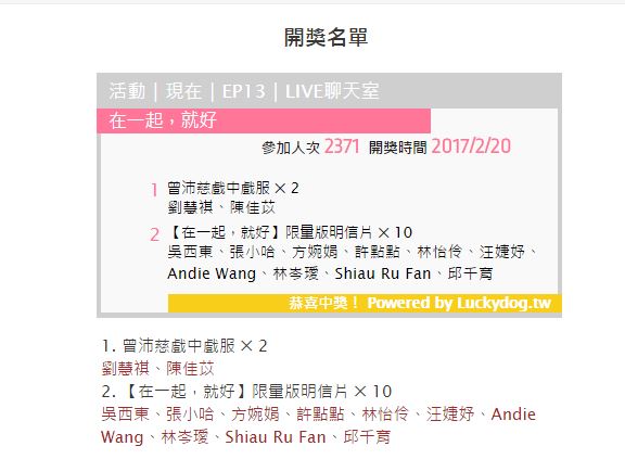 恭喜以下粉絲獲得【在一起,就好】限量版明信片10名:吳西東、張小哈、方婉娟、許點點、林怡伶、汪婕妤、Andie Wang、林岑璦、Shiau Ru Fan、邱千育